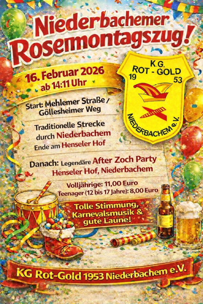 Veröffentlicht am 29. Januar 202629. Januar 2026 von PrinzNB16.02.2026 Rosenmontagszug Niederbachem mit legendärer After Zoch Party im Henseler Hof